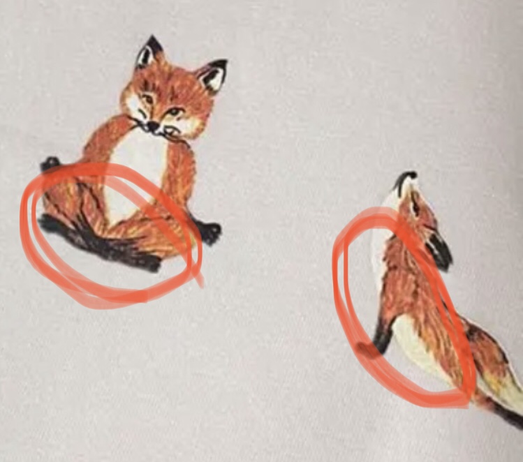 偽物は目に光がない(少ない)ですね。こんなもの着ていたら、「〇〇ちゃんのキツネ、目が死んでるね…」と言われます。